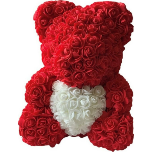 Αρκουδάκι κόκκινο από τεχνητά τριαντάφυλλα με άσπρη καρδιά