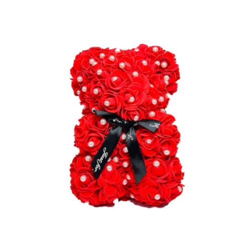 Αρκουδάκι από τεχνητά τριαντάφυλλα σε κόκκινο χρώμα με πέρλες