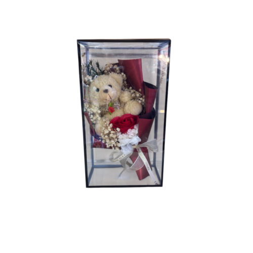 Κουτί δώρου με ανθοδέσμη και αρκουδάκι