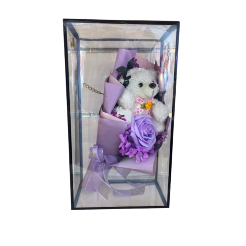 Κουτί δώρου με ανθοδέσμη και αρκουδάκι σε μωβ χρώμα