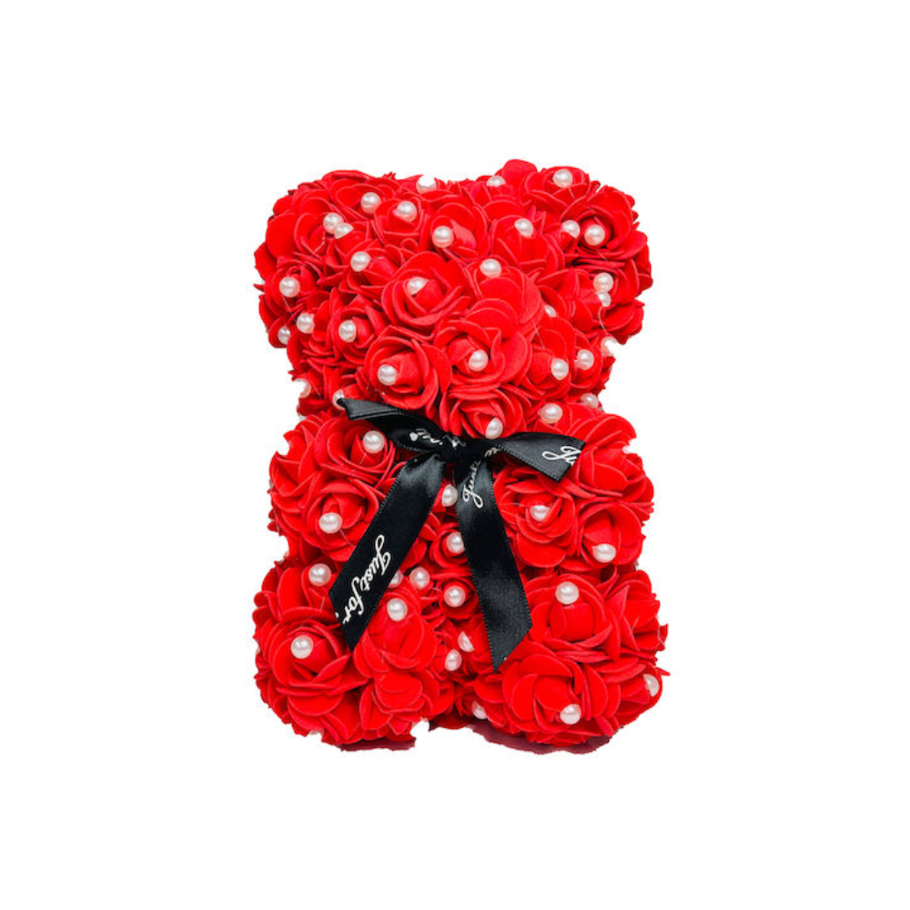 • Αρκουδάκι από τεχνητά τριαντάφυλλα σε κόκκινο χρώμα με πέρλες