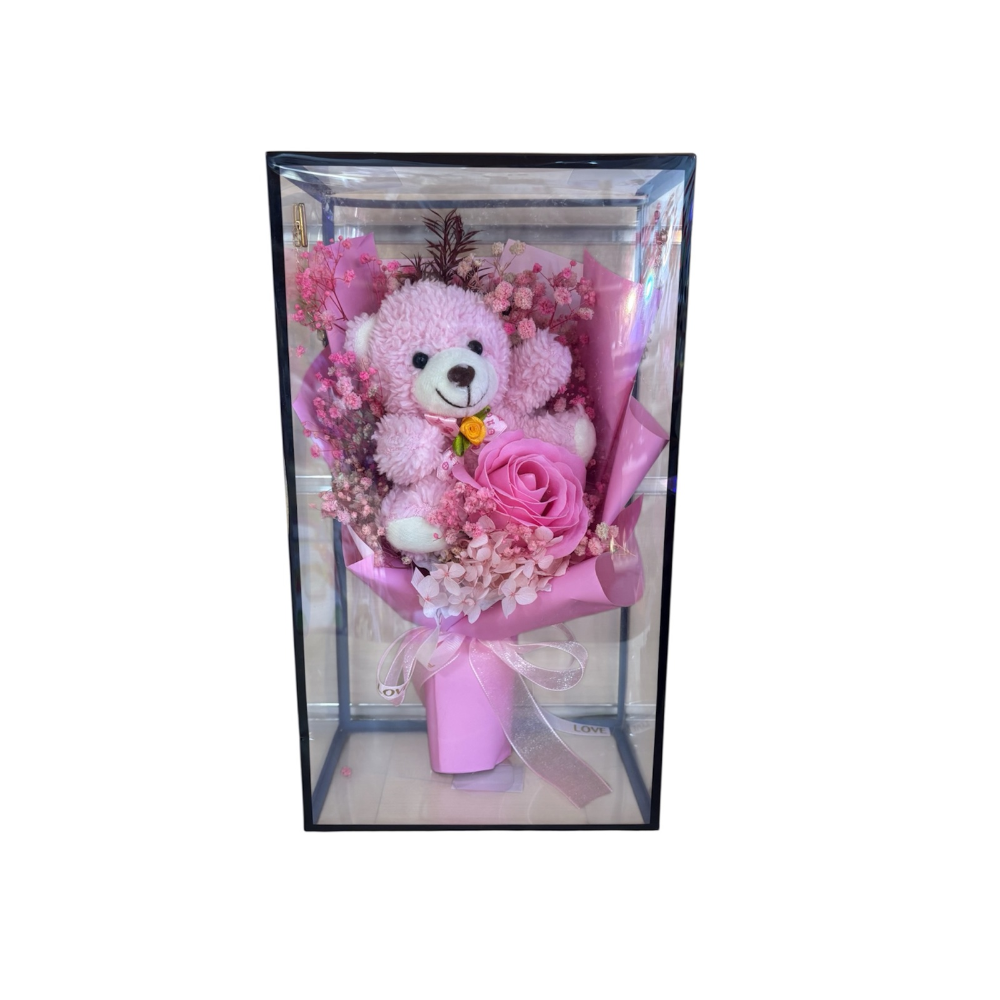 Κουτί δώρου με ανθοδέσμη και αρκουδάκι σε ροζ χρώμα